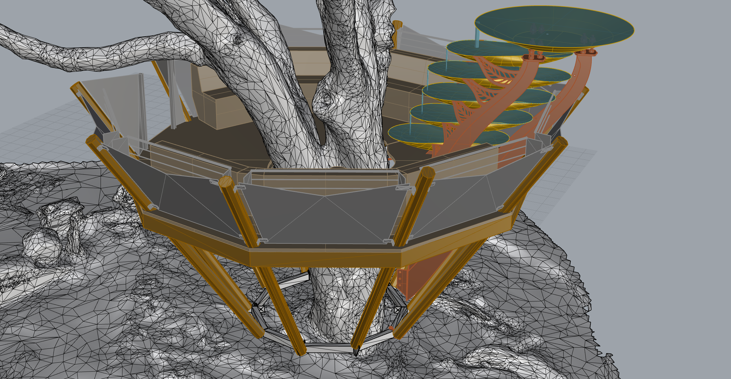 For the Euphoric project, I was tasked with re-configuring existing assets built onsite. My focus was on two main components: the raised deck around the tree, and the geodesic sphere. I used existing site photos to measure and render possible options prior to presenting them to the client.